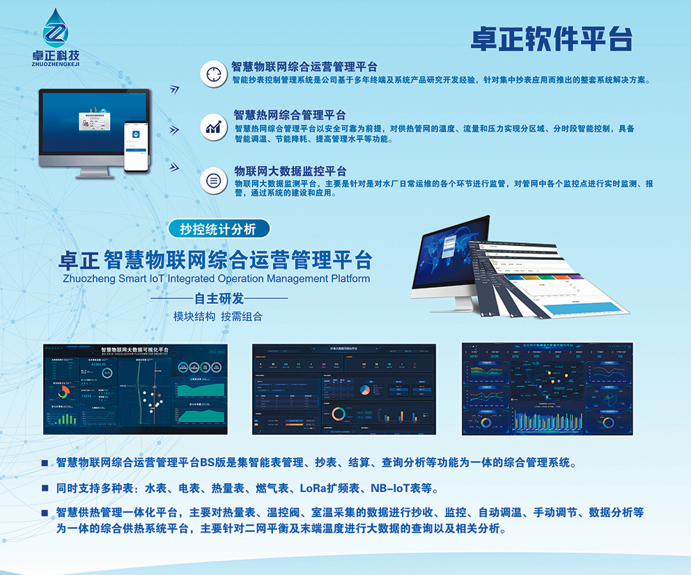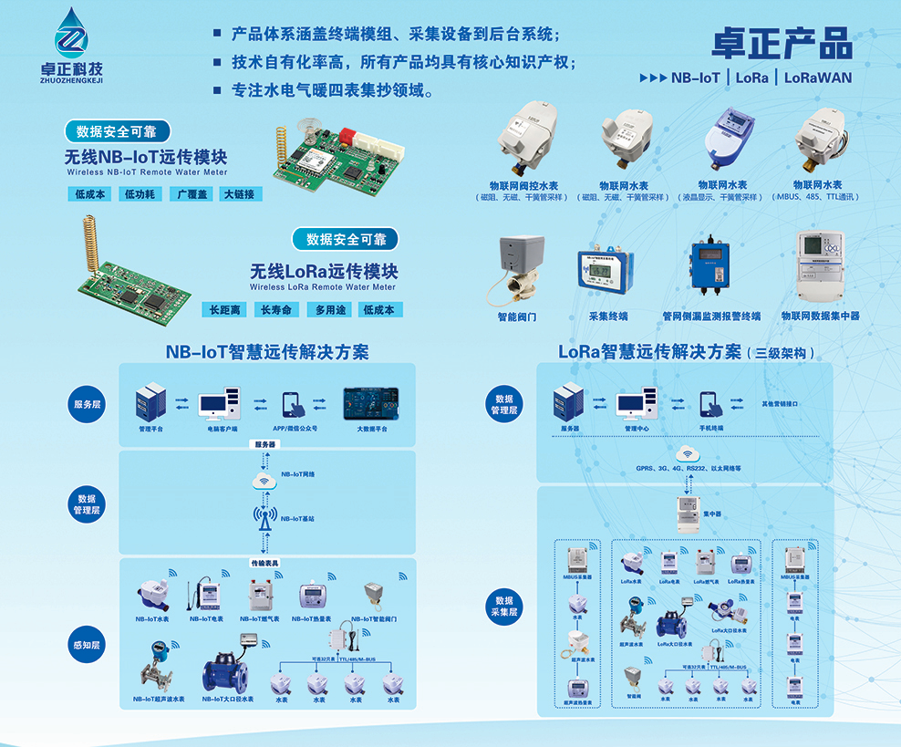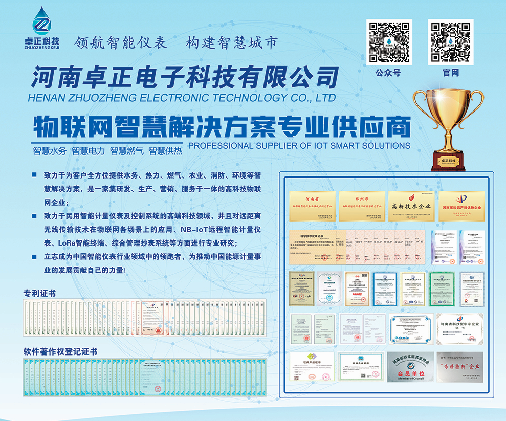 河南卓正電子科技有限公司,專(zhuān)業(yè)的物聯(lián)網(wǎng)表應(yīng)用方案提供商,擁有一支多名博士、碩士組成的核心研發(fā)團(tuán)隊(duì),率先將NB-IoT、LoRa遠(yuǎn)傳技術(shù)、智能閥控技術(shù)應(yīng)用于水務(wù)、熱力、燃?xì)?、農(nóng)業(yè)、消防、環(huán)境領(lǐng)域,以“領(lǐng)航智能儀表 構(gòu)建智慧城市”為企業(yè)使命,立志成為中國(guó)智能儀表行業(yè)領(lǐng)域中的領(lǐng)跑者,為推動(dòng)中國(guó)能源計(jì)量事業(yè)的發(fā)展貢獻(xiàn)自己的力量!